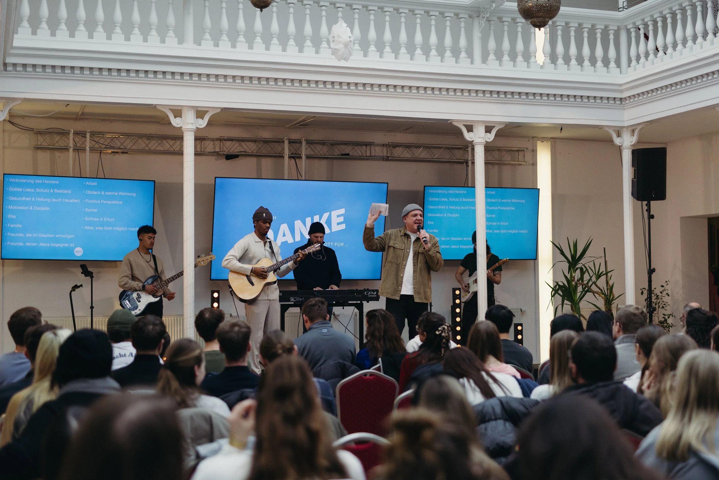 Gottesdienste starten bei uns mit Musik, die modern, laut genug zum Mitsingen, aber auch ruhig genug zum Ankommen ist. Danach gibt es einen Impuls aus der Bibel, der im Hier und Jetzt relevant ist.